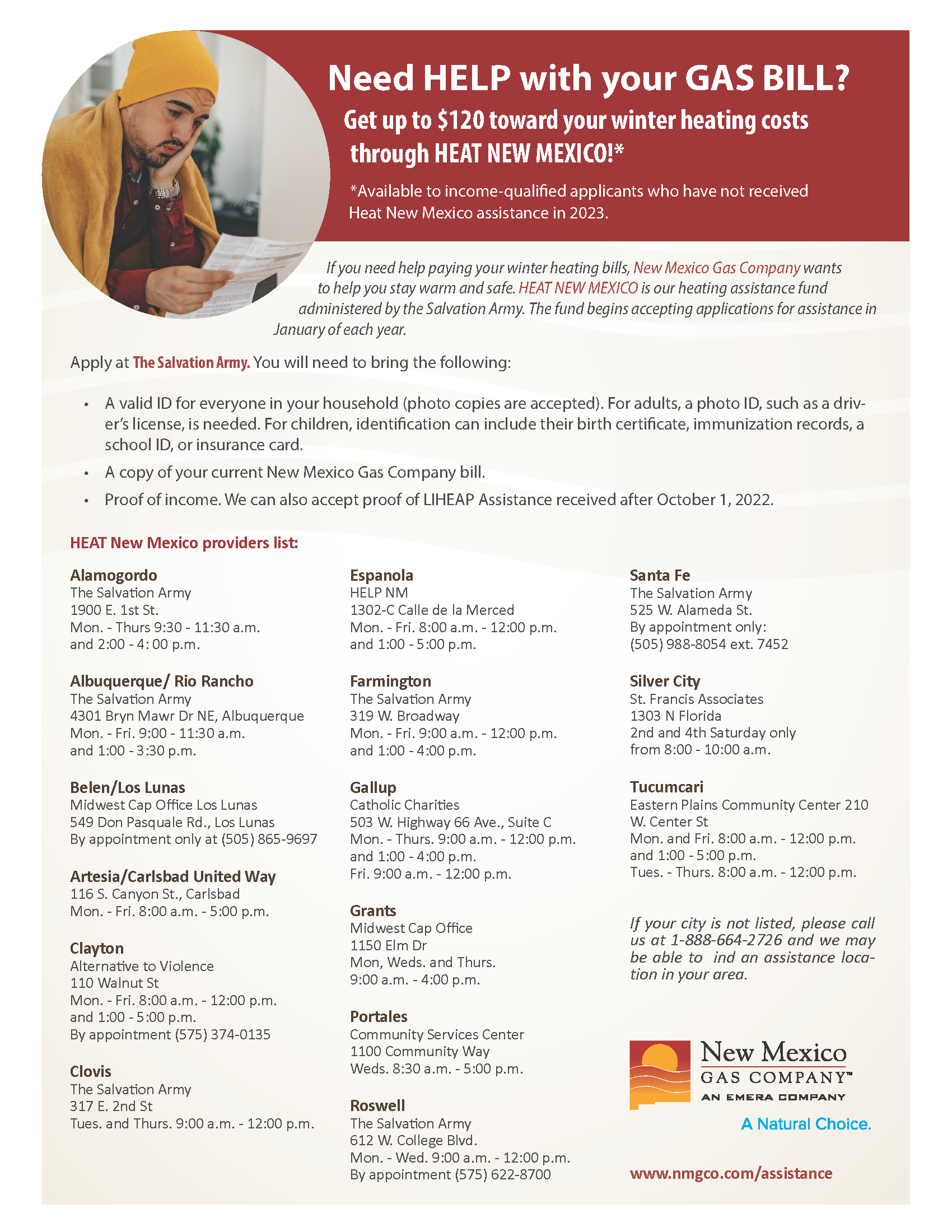If you need help paying your winter heating bills, New Mexico Gas Company wants to help you stay warm. HEAT New Mexico is our heating assistance fund, administered by the Salvation Army.